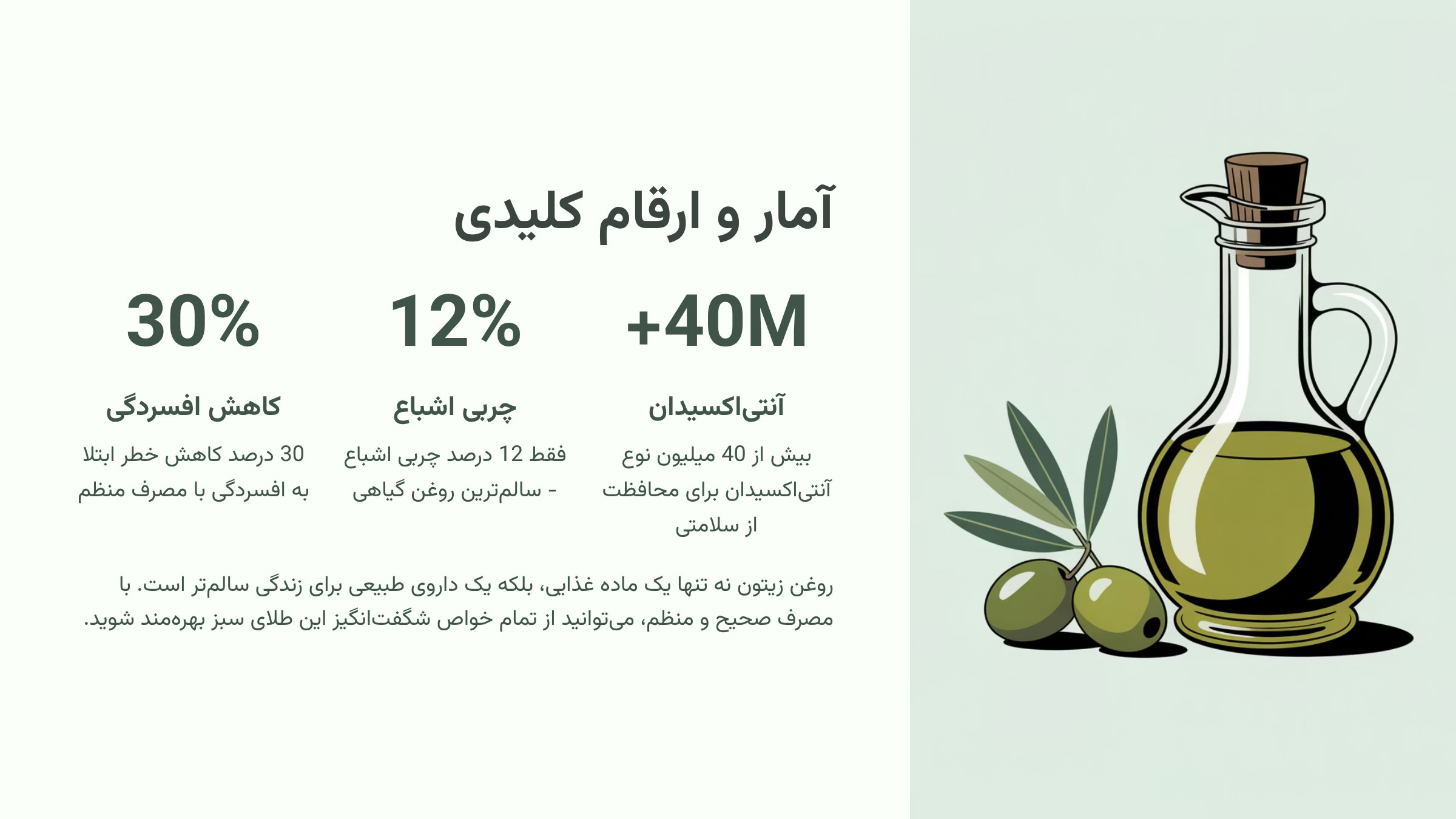 | مبارزه با افسردگی با مصرف روغن زیتون | مصرف روغن زیتون به دلیل خاصیت ضد التهابی و تأثیر مثبت بر هورمونها، به بهبود وضعیت روحی و کاهش خطر افسردگی کمک میکند. |