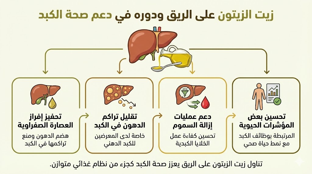 تشير بعض الدراسات الحديثة إلى أن تناول زيت الزيتون على الريق قد يساهم في دعم صحة الكبد بشكل غير مباشر، بفضل تركيبته الغنية بالدهون الصحية والمركبات المضادة للأكسدة. فعند دخول زيت الزيتون إلى الجسم والمعدة فارغة، يتم امتصاص مكوناته بسهولة أكبر، ما يساعد على تحفيز بعض الوظائف الحيوية المرتبطة بالكبد.