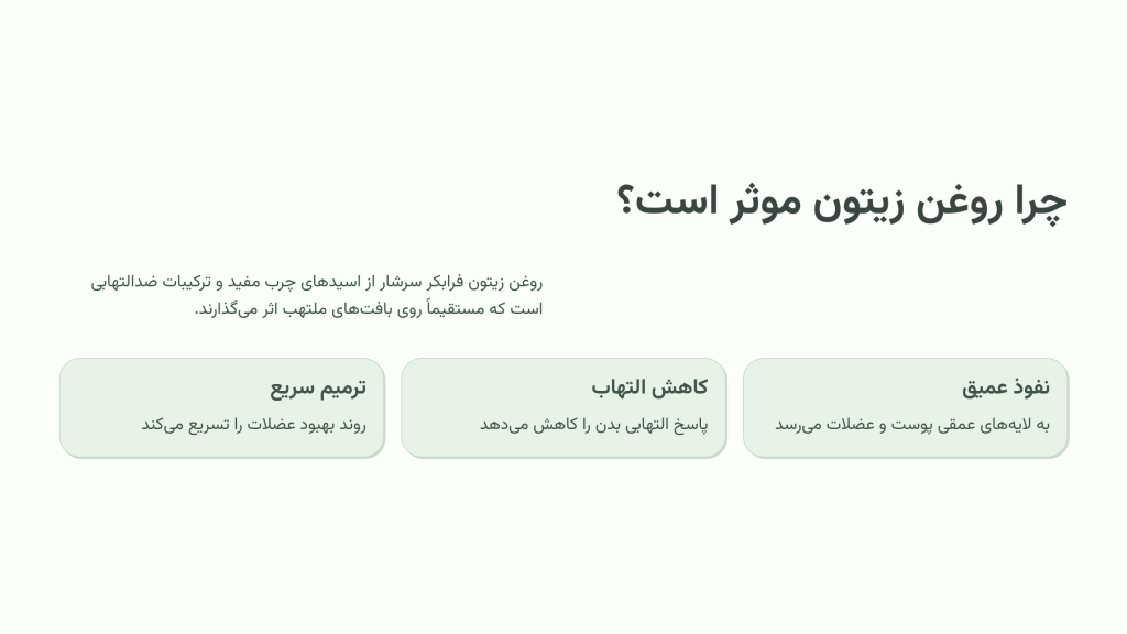 | راهکار پیشنهادی | استفاده از روغن زیتون برای کاهش درد و آرامسازی عضلات |