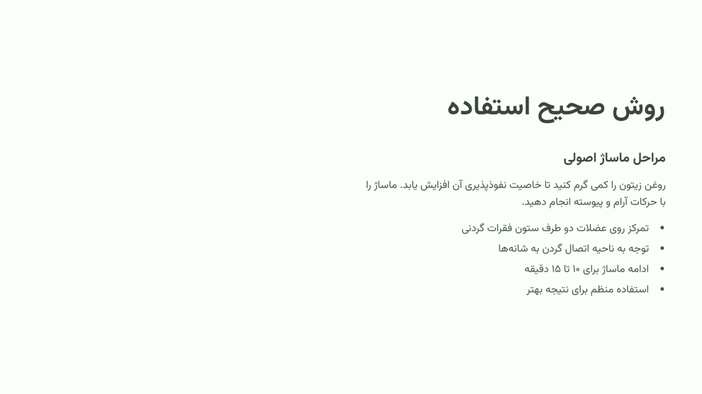 | روش استفاده | ماساژ با روغن زیتون کمی گرم شده با حرکات آرام و پیوسته |
