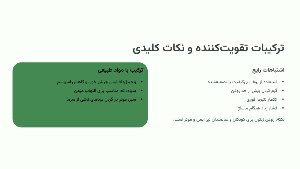 در مواردی که گردن درد شدیدتر است یا سابقه طولانیتری دارد، میتوان اثر روغن زیتون را با ترکیب آن با مواد طبیعی دیگر افزایش داد. این ترکیبها اغلب در طب سنتی برای دردهای عضلانی توصیه میشوند و میتوانند نقش مکمل قوی داشته باشند.