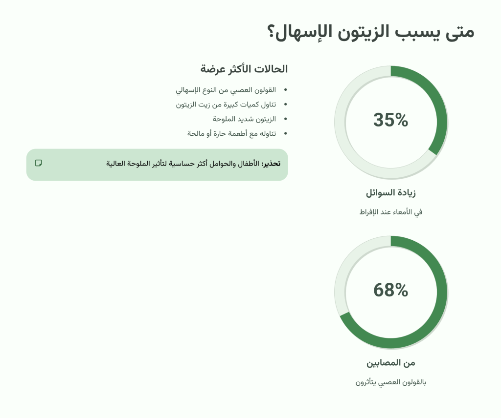 ومن المهم أيضاً أن نذكر أن زيت الزيتون البكر، رغم كونه صحياً ومفيداً في معظم الحالات، يمكن أن يعمل كمليّن قوي إذا استُهلك بكمية كبيرة أو في وقت غير مناسب مثل تناوله على معدة فارغة. لذلك فإن تأثير الزيتون لا يُفهم من عنصر غذائي واحد فقط، بل من تركيبة متكاملة قد تكون نافعة أو مهيّجة تبعاً للكمية والبيئة الهضمية.