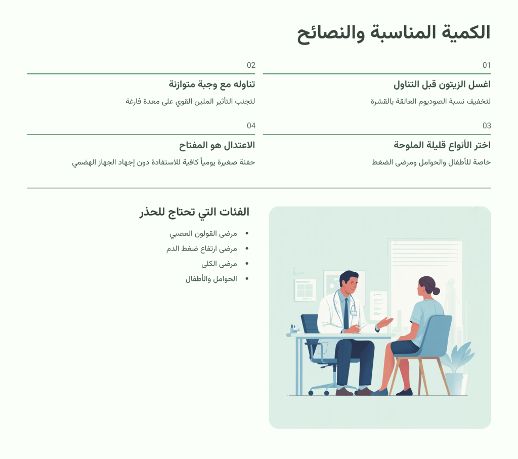 إن الاعتدال في الكمية، وغسل الزيتون قبل تناوله، وتجنب الأنواع التي تحتوي على محلول ملحي مركز، إضافة إلى اختيار زيت الزيتون البكر الممتاز بدلاً من الأصناف التجارية الرخيصة — كل هذا يجعل الزيتون جزءاً من نمط غذائي صحي يدعم الهضم بدلاً من أن يربكه. وبذلك يصبح الزيتون طعاماً مفيداً لا عبئاً غذائياً، ووسيلة لتعزيز توازن الأمعاء لا سبباً في اضطرابها.